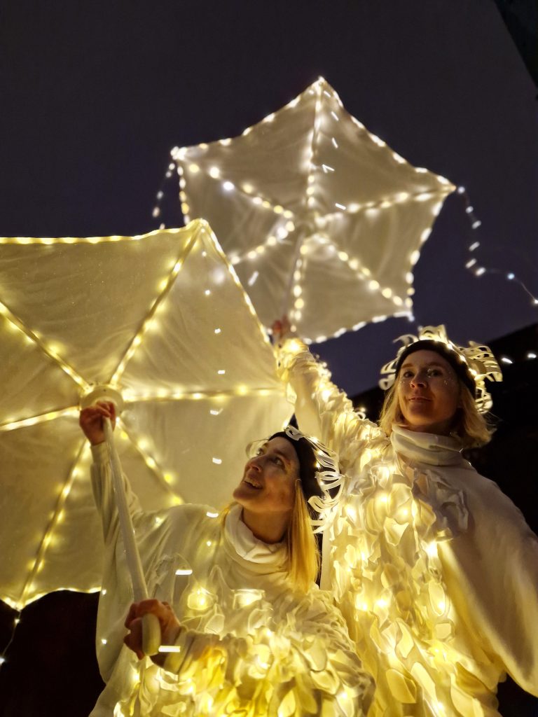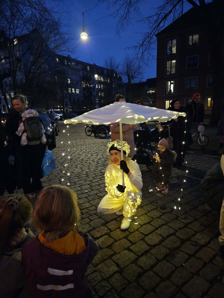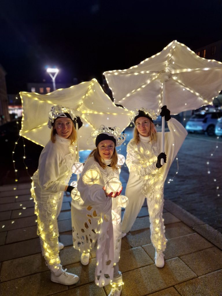LysLevende er en lysperformance med dans, musik og lys, som oprindeligt blev skabt i Corona-nedlukningen, hvor vi turnerede rundt i baggårde for at sprede glæde, håb og fællesskab. Siden har vi optrådt med vores venlige, magiske og dansende lysvæsner i mange sammenhænge. Lysvæsnerne har blandt andet været ude at svinge deres lysparaplyer på julemarkeder, plejehjem, lysfester (fx arrangeret af kirker eller biblioteker), juleafslutninger og på kulturnatten.